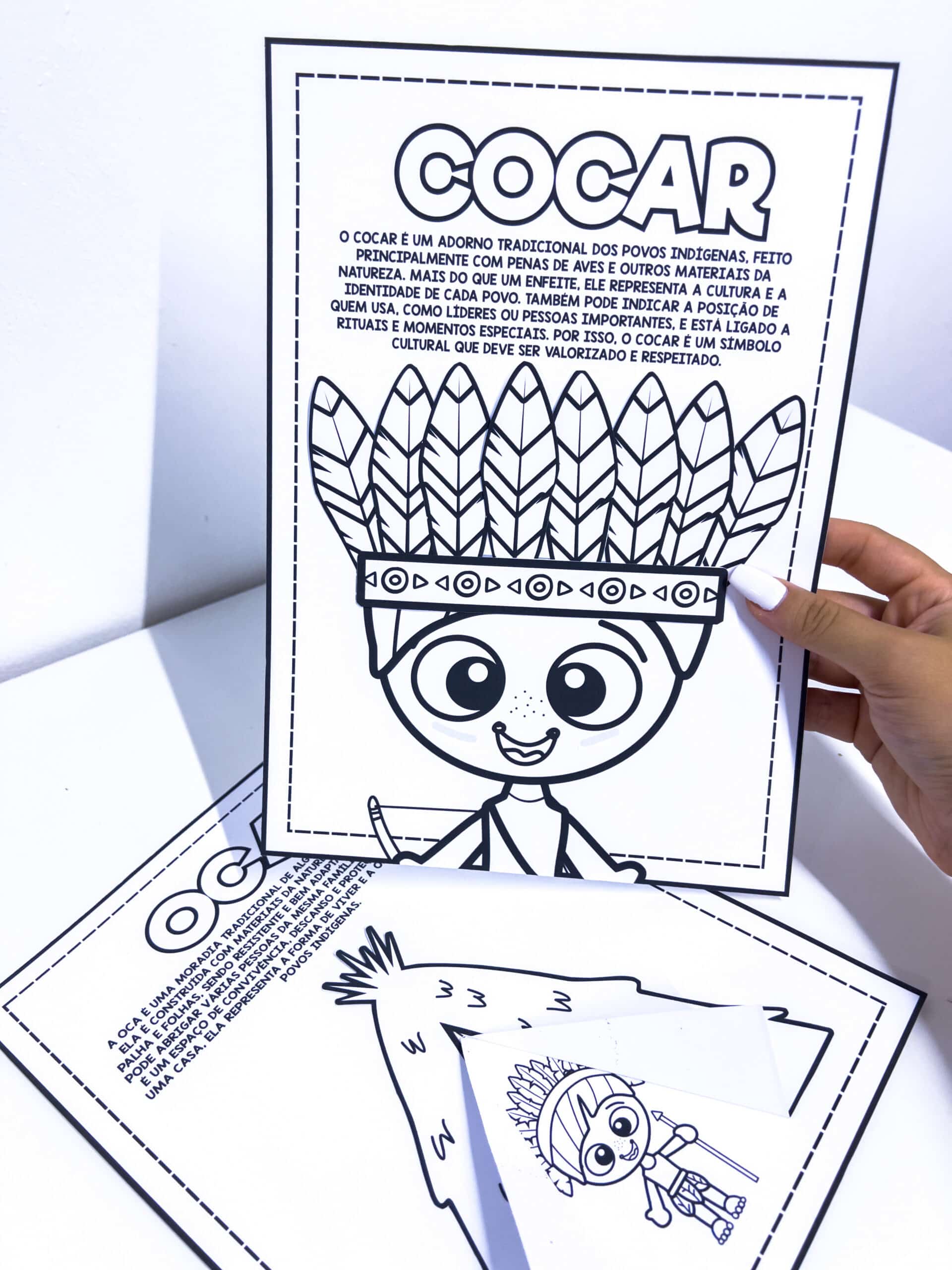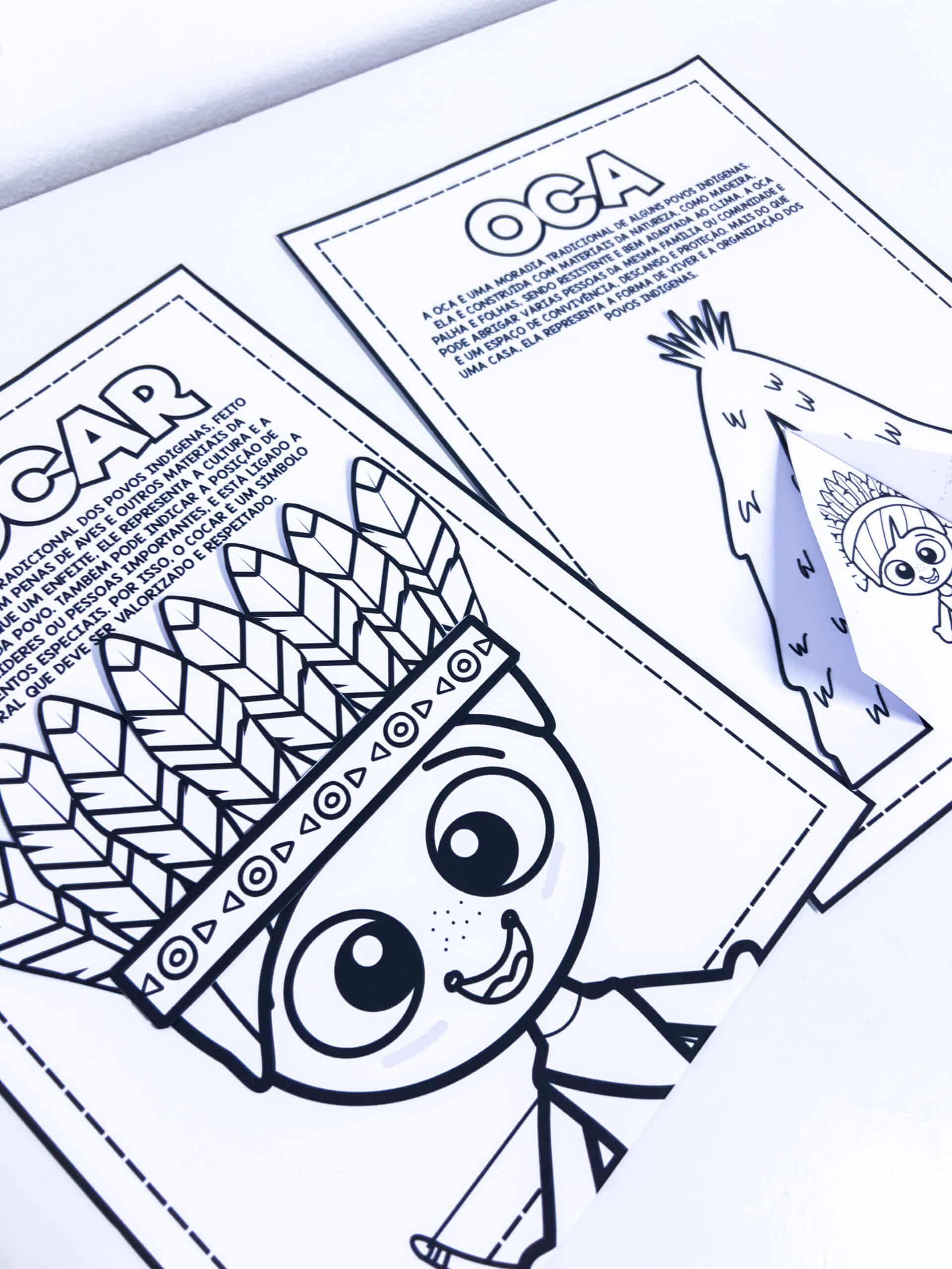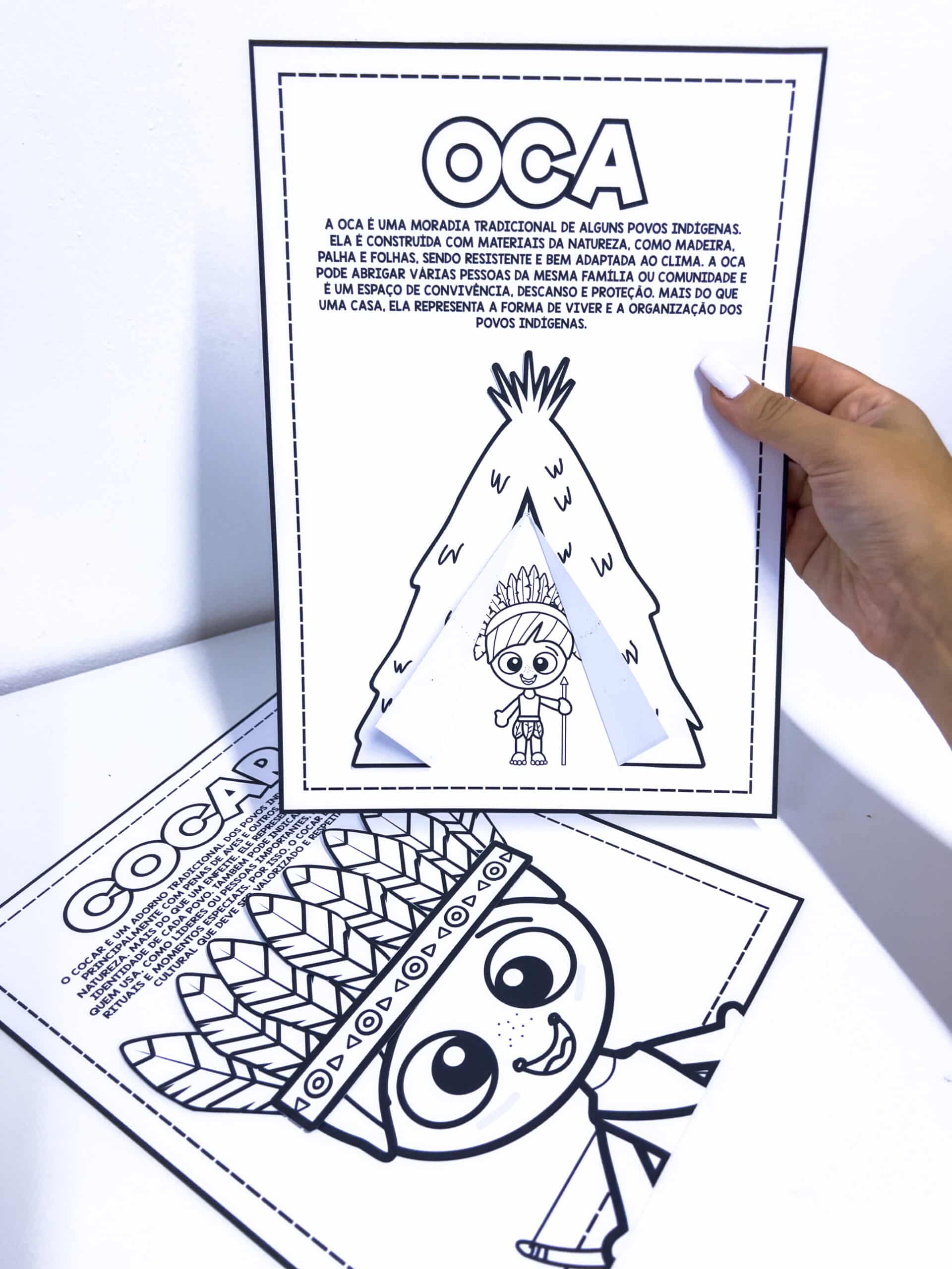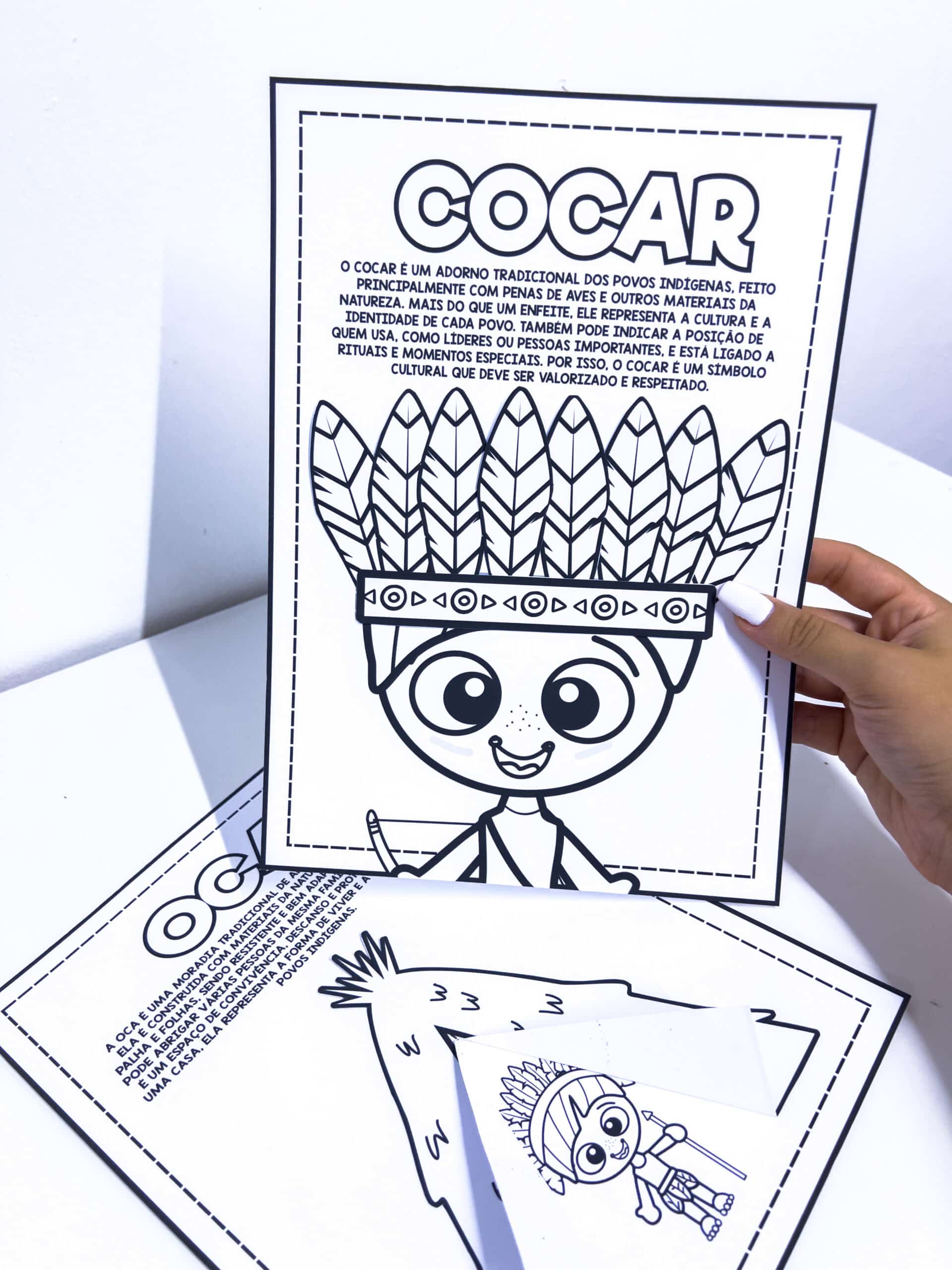 Atividade Interativa – Oca e Cocar (Povos Indígenas) Material pedagógico lúdico e educativo que aborda elementos importantes da cultura dos povos indígenas: o cocar e a oca. A proposta promove o aprendizado de forma interativa, valorizando a diversidade cultural e estimulando o interesse das crianças pelo tema. O material é composto por duas atividades interativas, cada uma formada por duas folhas, totalizando quatro folhas: - Atividade do cocar: contém uma breve explicação e uma ilustração para colorir, onde as crianças recortam e colam as penas no personagem, montando o cocar. - Atividade da oca: apresenta uma explicação simples sobre a oca, acompanhada de uma proposta interativa para colorir e montar.