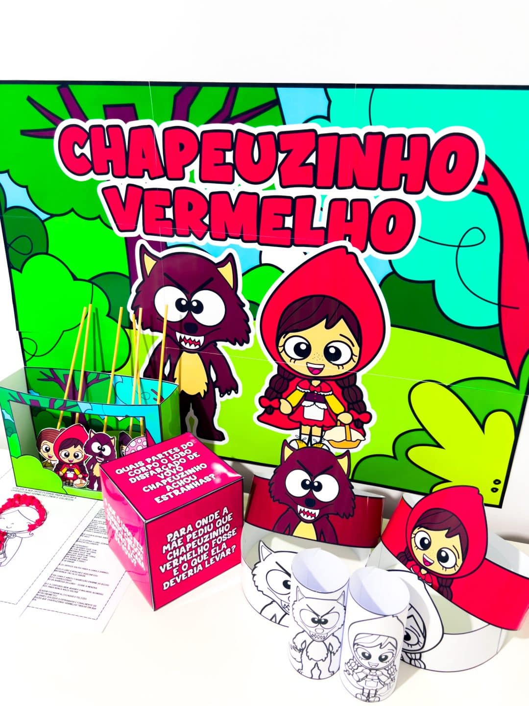 ⭐Kit Conto Chapeuzinho Vermelho Um material lúdico e interativo desenvolvido para tornar a contação da clássica história da Chapeuzinho Vermelho ainda mais divertida e educativa. O kit é completo e oferece diferentes recursos que estimulam a criatividade, a imaginação e a participação ativa das crianças. ⭐Conteúdo do kit: - Painel ilustrado com cores vibrantes e personagens em estilo infantil; - Cenário dobrável que dá vida às encenações; - Personagens em palito (Chapeuzinho, Lobo Mau, Vovó, Lenhador e Mamãe) para teatro de fantoches; - Coroas e adereços dos personagens, permitindo que as crianças vivenciem a história de forma dramatizada; - Dados de perguntas para trabalhar a interpretação do conto, incentivando a leitura e a oralidade; - Atividades impressas para colorir, colagem e completar a narrativa. ⭐Objetivos pedagógicos: Estimular a imaginação e expressão oral; Desenvolver a interpretação de texto de forma lúdica; Incentivar o gosto pela leitura; Promover o trabalho em grupo e a dramatização; Explorar diferentes linguagens artísticas (teatro, desenho, colagem).