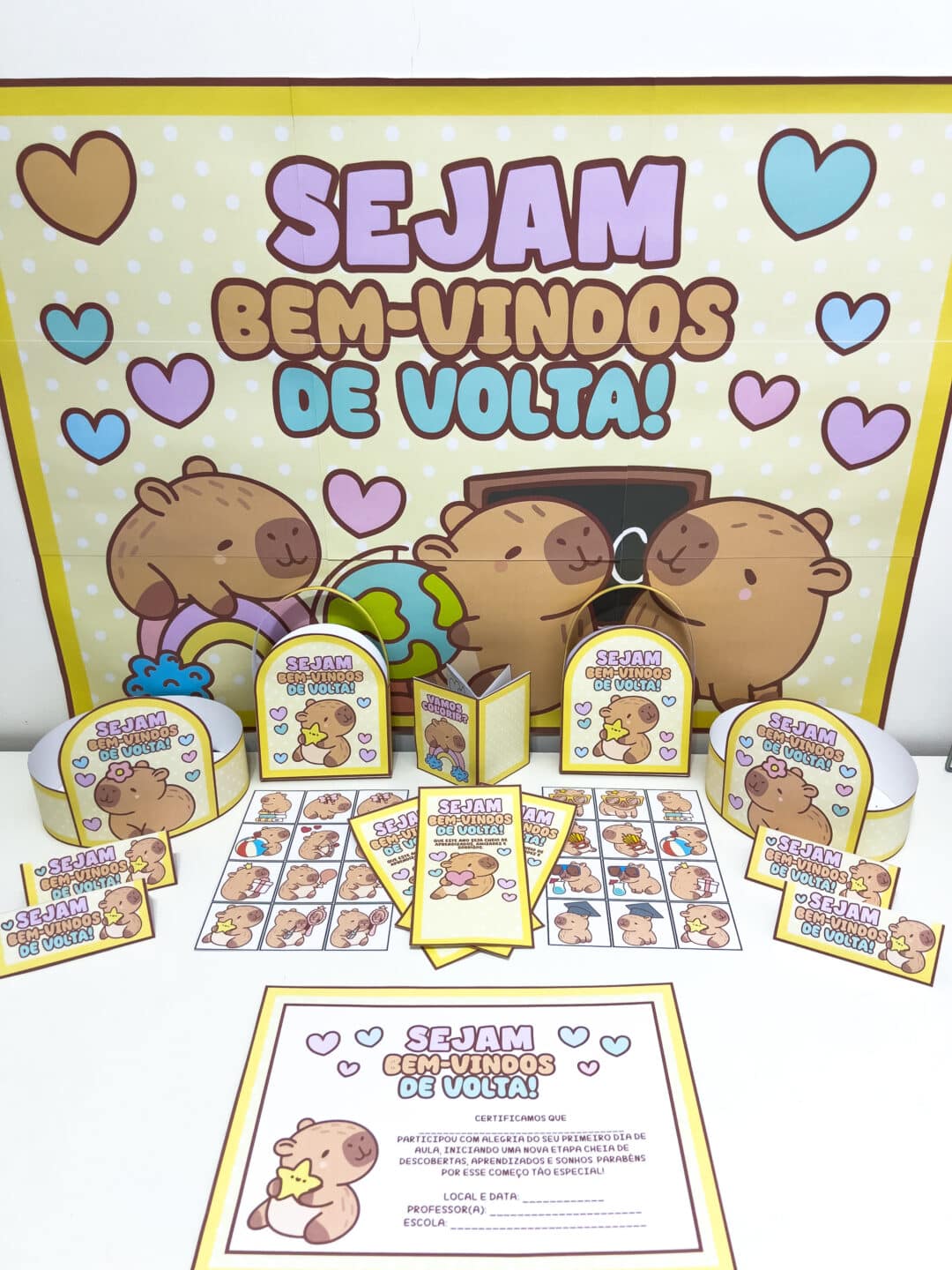⭐O Kit Volta às Aulas Capivara Fofa foi criado para tornar o retorno às aulas ainda mais acolhedor, divertido e cheio de carinho. Com ilustrações delicadas e encantadoras de capivaras fofinhas, o kit é ideal para receber os alunos de forma especial, criando um clima de alegria e pertencimento desde o primeiro dia. ⭐O kit contém: - Coroa temática, perfeita para celebrar o primeiro dia de aula e fazer a criança se sentir protagonista. - Cartão de boas-vindas, ideal para mensagens carinhosas da escola ou do professor. - Librinho de colorir, com ilustrações do tema para estimular a criatividade e acalmar no início da rotina escolar. - Certificado de Primeiro Dia de Aula, registrando esse momento tão importante. - Painel decorativo, para ambientar a sala de aula de forma lúdica e encantadora. - Tags para plásticos e sacolinhas, facilitando a personalização de lembrancinhas. - Sacolinhas temáticas, ideais para entregar os materiais e lembranças aos alunos. - Jogo da memória, promovendo diversão, atenção e interação entre as crianças.