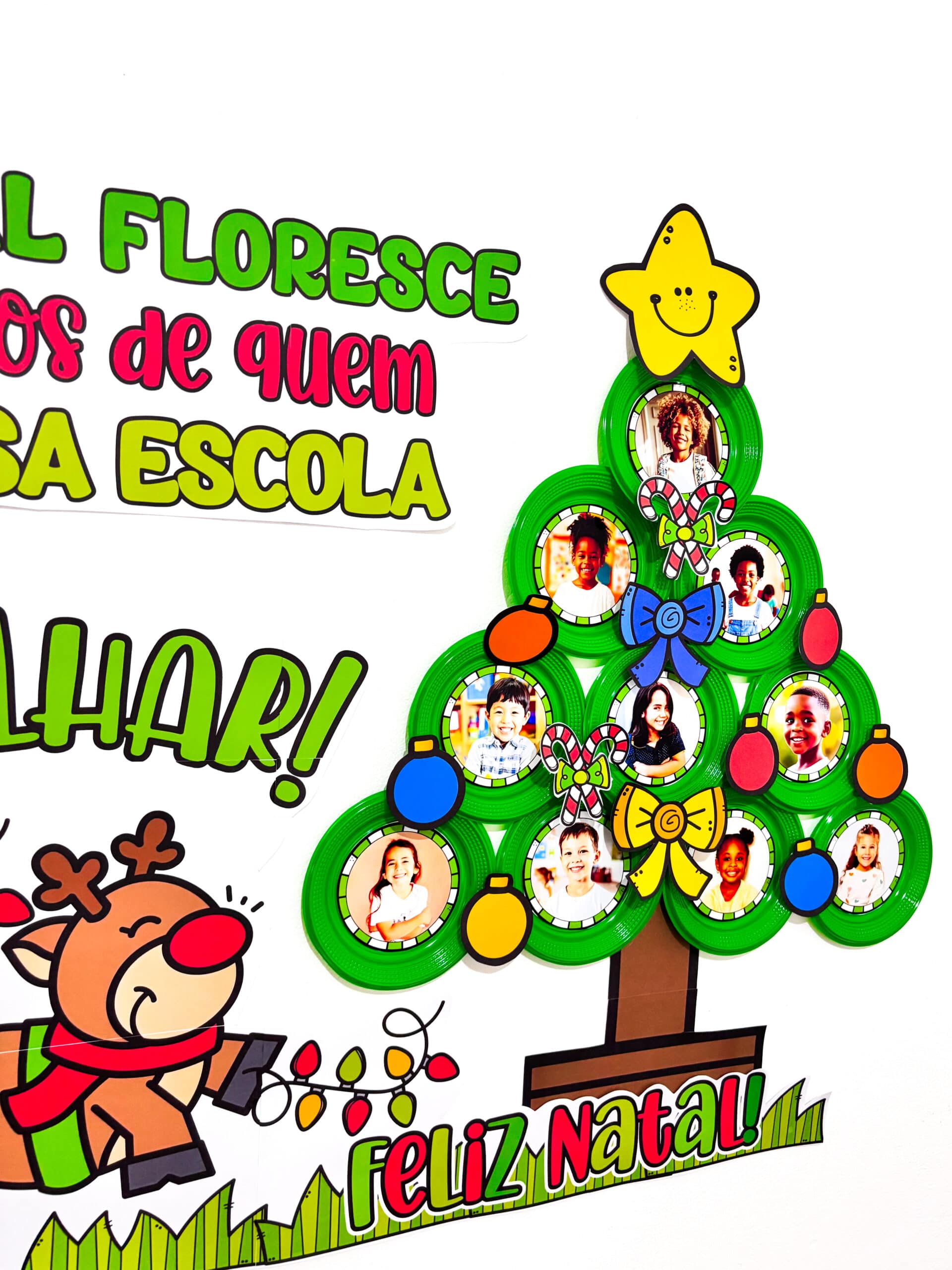 ⭐Se a ideia era criar um painel que arrancasse suspiros… missão cumprida! ⭐O painel “Rostinhos de Natal” é aquele material que transforma o ambiente e faz todo mundo parar para admirar. ⭐Com cerca de 1,34 x 0,95 m, ele impressiona pelo tamanho e encanta pelos detalhes, especialmente pela árvore feita com pratinhos descartáveis, que ganha vida com as fotos dos alunos. ⭐Fala sério: esse efeito 3D ficou simplesmente irresistível! É criativo, é afetivo, é a cara da escola que valoriza cada rostinho que faz parte da história da turma. ⭐O Papai Noel animado, o trenó, as luzinhas e as cores vibrantes completam a cena, levando aquele clima natalino cheio de acolhimento para qualquer espaço