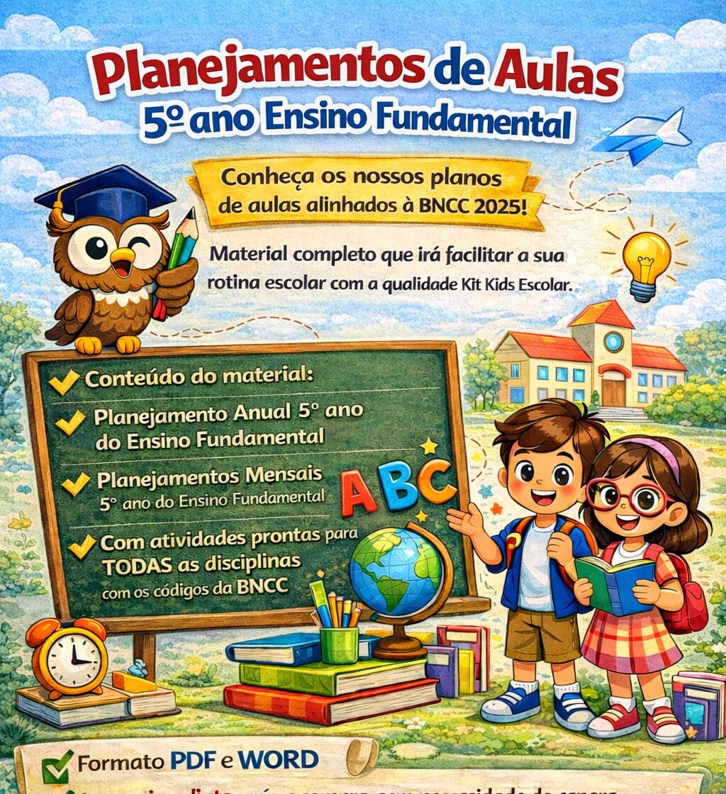 ⭐Planejamentos de Aulas 5º ano Ensino Fundamental ✅Conheça os nossos planos de aulas alinhados a BNCC 2026! Material completo que irá facilitar a sua rotina escolar com a qualidade Kit Kids Escolar. ✅Conteúdo do material: ⭐Planejamentos Anual 5º ano do Ensino Fundamental ⭐Planejamentos Mensal 5º ano do Ensino Fundamental ⭐Com atividades prontas para TODAS as disciplinas com os códigos da BNCC ⭐Com conteúdo Bônus incluso ✅Formato PDF e WORD ✅Acesso imediato após a compra, sem necessidade de espera. ⭐Após adquirir o arquivo editável é liberado de imediato, sem pegadinhas.